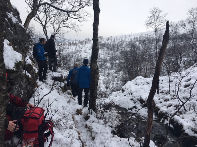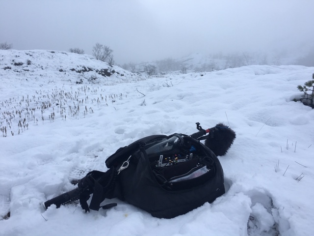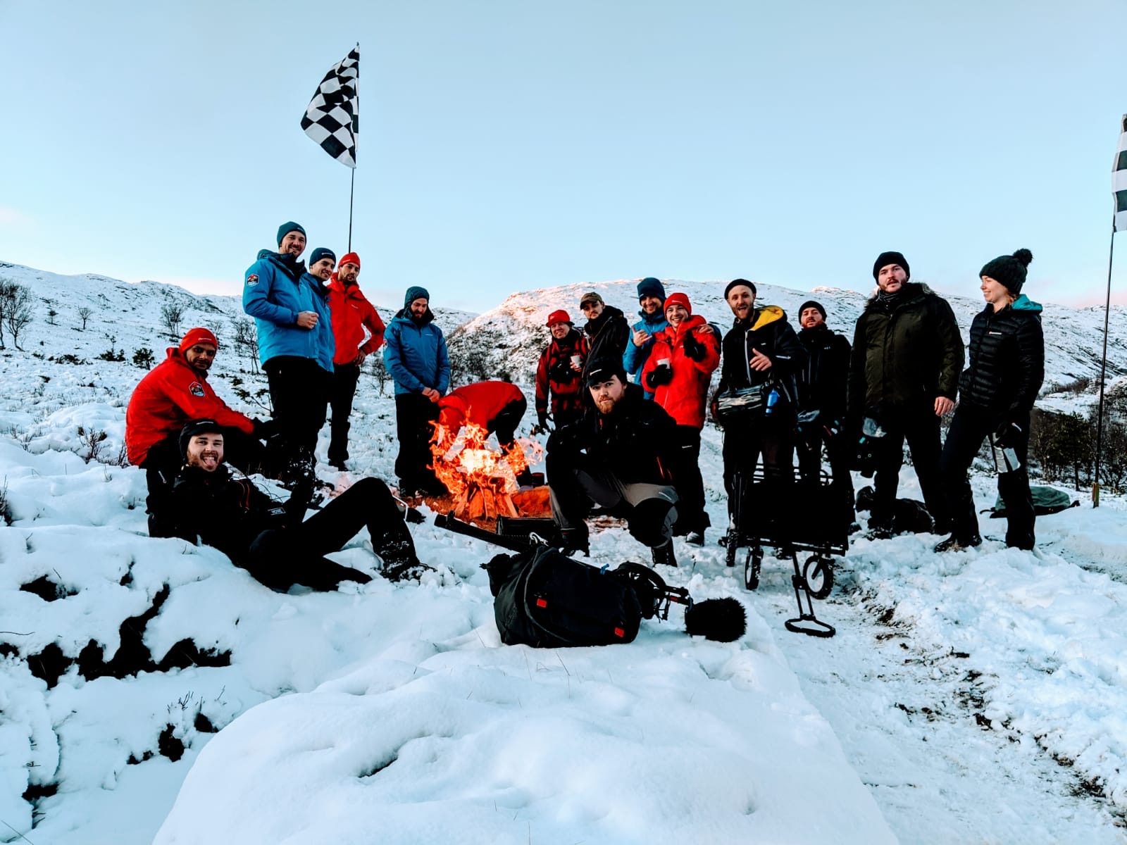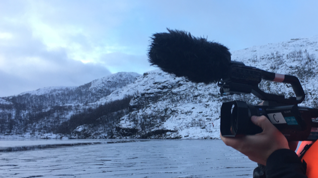 The river crossing wasn’t deep, and although potentially hazardous and slippery, we decided not to use Aquapacks to protect the transmitters from taking a dip, instead opting to carry a spare transmitter and a boom each as a precaution. In fact the greater danger came from the snow concealed gaps between rocks or through the tough shrubs we walked across. Occasionally someone would suddenly yelp and sink up to their thigh but luckily nobody was hurt, to the medics relief. This was a really tough trek that involved a great deal of teamwork both between the teams and between myself and the cameraman as we hauled ourselves and equipment through the course. It was definitely my most physical day ever at work. At the finish line we were greeted with a cup of strong coffee and slice of Sjokoladekake (chocolate cake). There may have also been a shot of whisky to warm up with by the fire as the light began to fade. What a great trip with old friendships strengthened and new ones made.